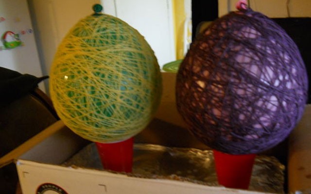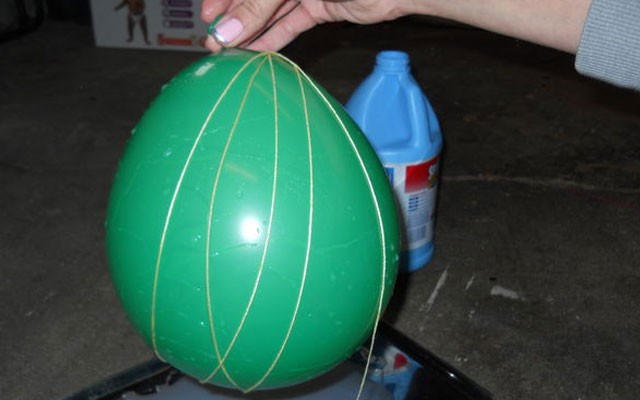В) Как только вынули нить из клея, сразу же обматываем ею надутый шарик так, чтобы между витками оставались небольшие отверстия.