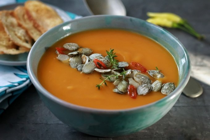 Для вкуснейшего тыквенного крема понадобятся ингредиенты: две столовых ложки оливкового масла, луковица, три стакана нарезанной моркови, тыква, ложка тертой кожицы апельсина, три стакана воды, пол чайной ложки имбиря, столовая ложка апельсинового сока, столовая ложка молотого тмина, соль и перец по вкусу. Первое, что нужно сделать – нагреть оливковое масло на сковороде, добавить нарезанный лук и жарить на протяжении нескольких минут, чтобы лук стал прозрачным. После этого, почистите и порежьте на кусочки тыкву и морковь, натрите апельсиновую кожицу, добавьте эти ингредиенты на сковороду, перемешайте, добавьте соль и перец. Все это должно поджариваться 15 минут, после чего добавьте воду. Сделайте медленный огонь, доведите до готовности, добавляя сок апельсина, имбирь и тмин. Декорировать такой крем можно семенами кунжута.