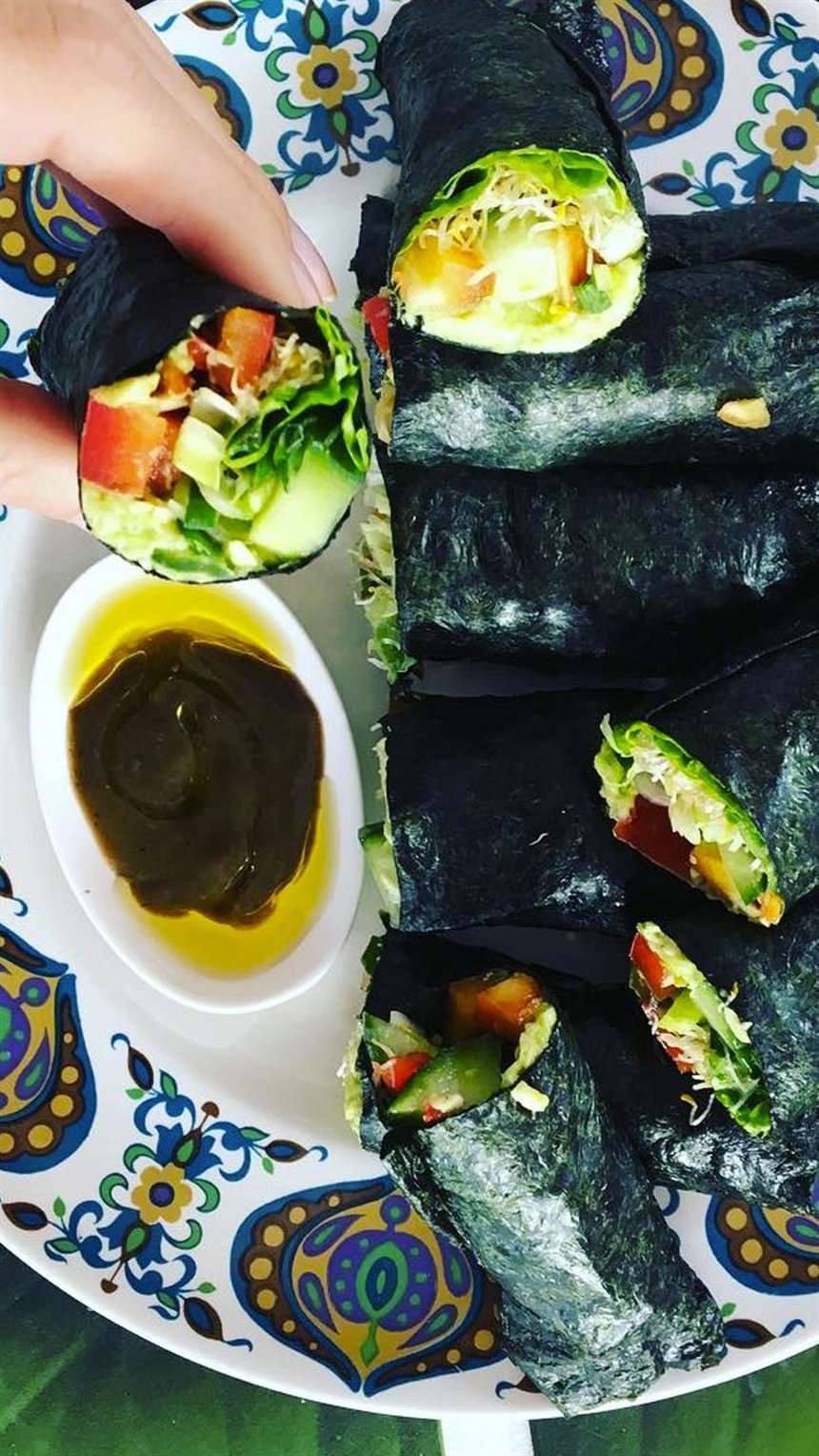 Чтоб приготовить такие суши, возьмите те ингредиенты, которые вы обычно выбираете для легкого салата. Порежьте их на полоски, отделите все ингредиенты и разложите в линиях на лист Нори. Когда придадите форму ролла при помощи коврика для суши, разрежьте аккуратно на стандартные кусочки.