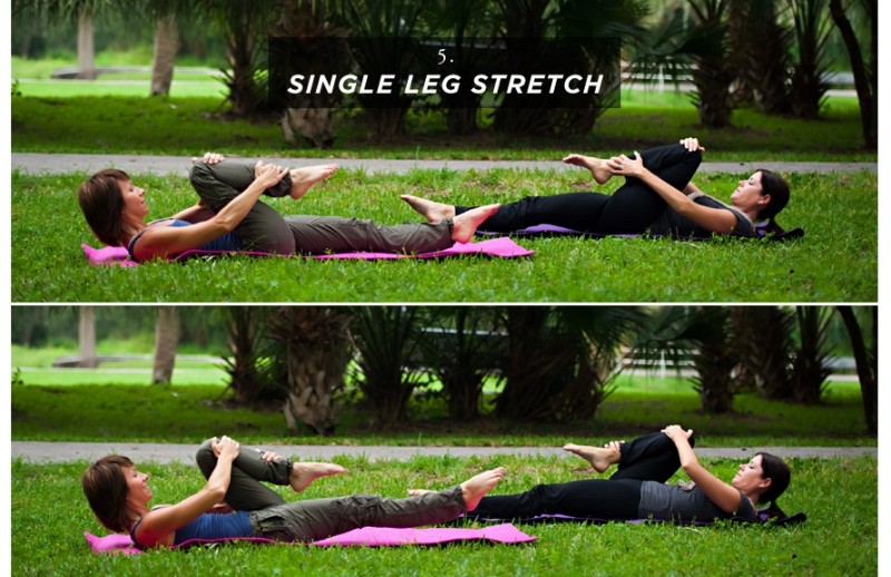 Для начала, сядьте таким образом, чтобы одно колено прижималось к груди, а другая нога оставалась прямой. Перекатитесь на спину, удерживая конечности в таком же положении. Сделайте вдох и синхронно выпрямите одну ногу, а другую согните к груди. Делайте выдох каждый раз, когда чередуете ноги. Плечи и прямая нога должны неотрывно лежать на земле, а подбородок упираться в грудь. Старайтесь, чтобы движения были четкими и гармоничными.