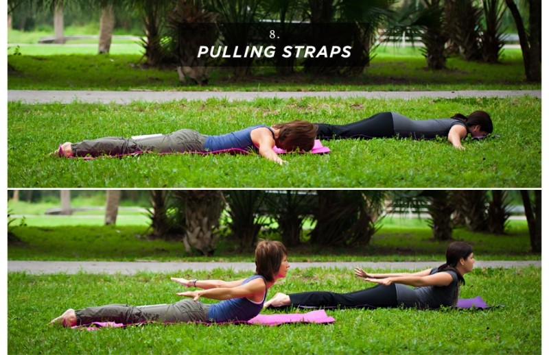 Лягте лицом вниз, разведите руки в стороны, а ноги плотно прижмите друг к другу. Затем, сделайте вдох и поднимите грудь вверх, вытягивая руки позади себя. Удерживайте позу некоторое время, и с выдохом возвращайтесь в исходную позицию. Повторите упражнение 5-10 раз.