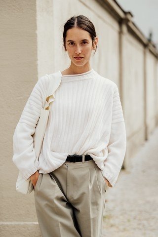 Одежда оверсайз удерживает популярность уже несколько сезонов. Поэтому образ с вещами оверсайз нейтральных тонов должен стать одним из самых стильных этой осенью. Комбинируйте серые брюки на высокой талии и белый свитер оригинального кроя. Черный пояс немного разбавит образ, а простая белая сумка сделает его еще более утонченным.