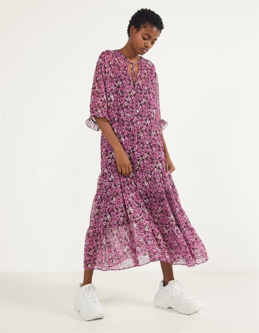 Длинные платья с цветочным принтом уже давно стали классикой весеннего сезона. Они выглядят очень романтично, женственно, нежно. В этом сезоне предпочитайте платья розовых или лиловых оттенков, как на фото. Ну а лучшая обувь к этому наряду – стильные кроссовки.