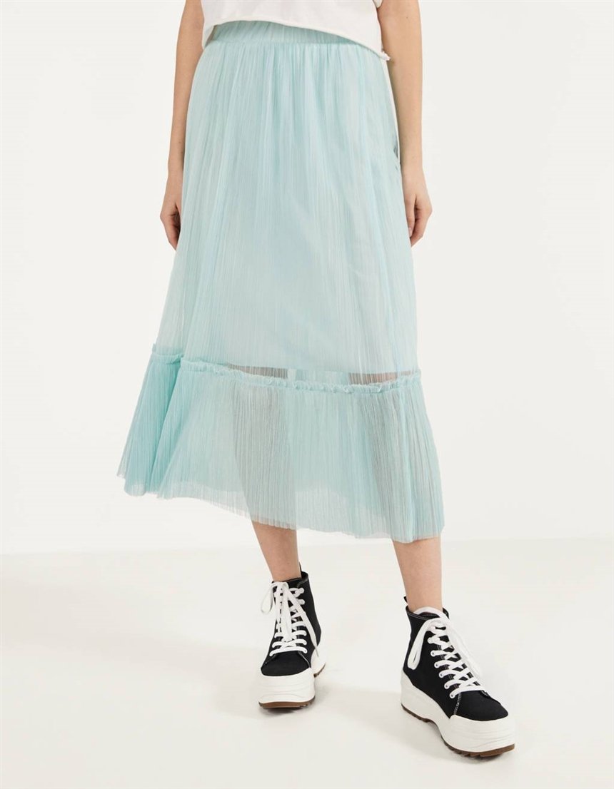 Юбки миди из шифона, да еще и в пастельном цвете обязательно должна быть в вашем гардеробе. Это одна из главных вещей романтического стиля. Комбинируйте с кедами и базовой футболкой.