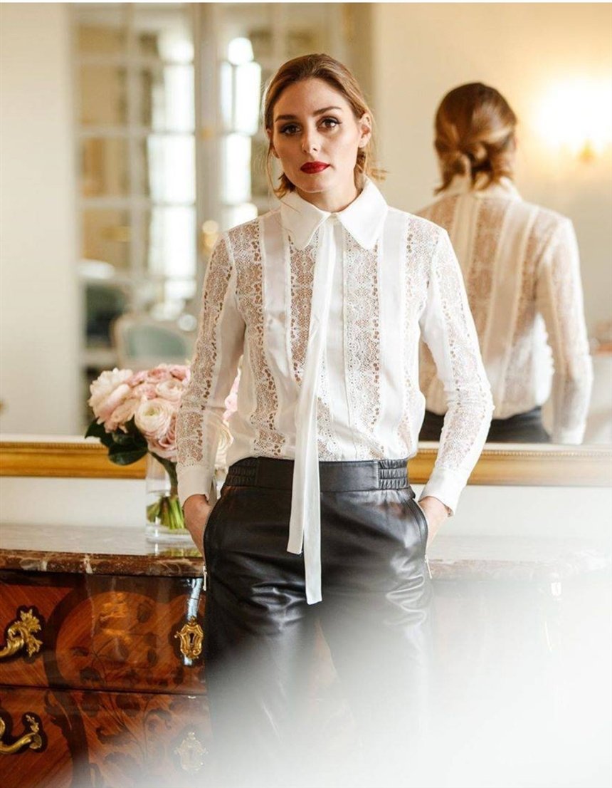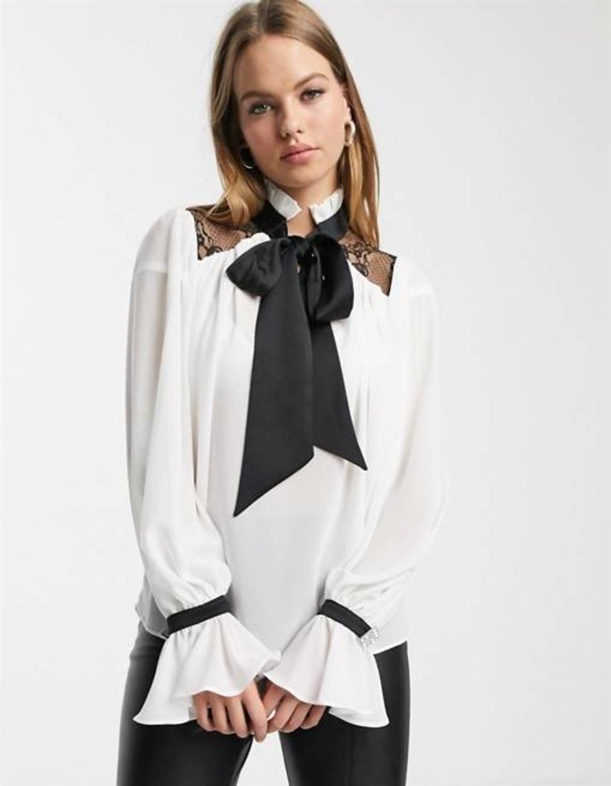 Это вариант для более формальных образов. Если вы ищете наряд для выхода на работу, то ищите блузку с элементами кружева и элегантным аскотом. Черные кожаные штаны станут идеальным дополнением.
