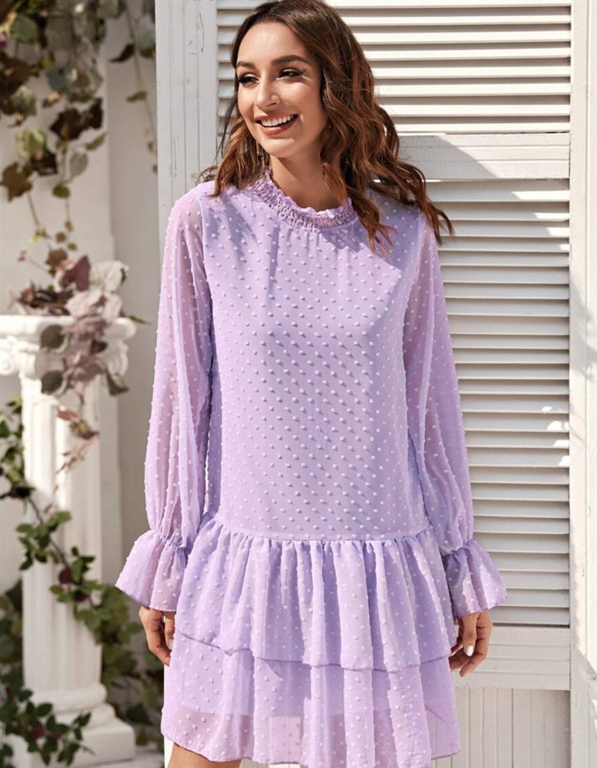 Оригинальный вариант, не правда ли? Образ, что на фото, доказывает, что горохи могут быть не только принтом, но и текстурой ткани. Эти маленькие круглые выпуклости на платье лилового цвета смотрятся очень нежно. Вдохновляйтесь этим романтическим образом.