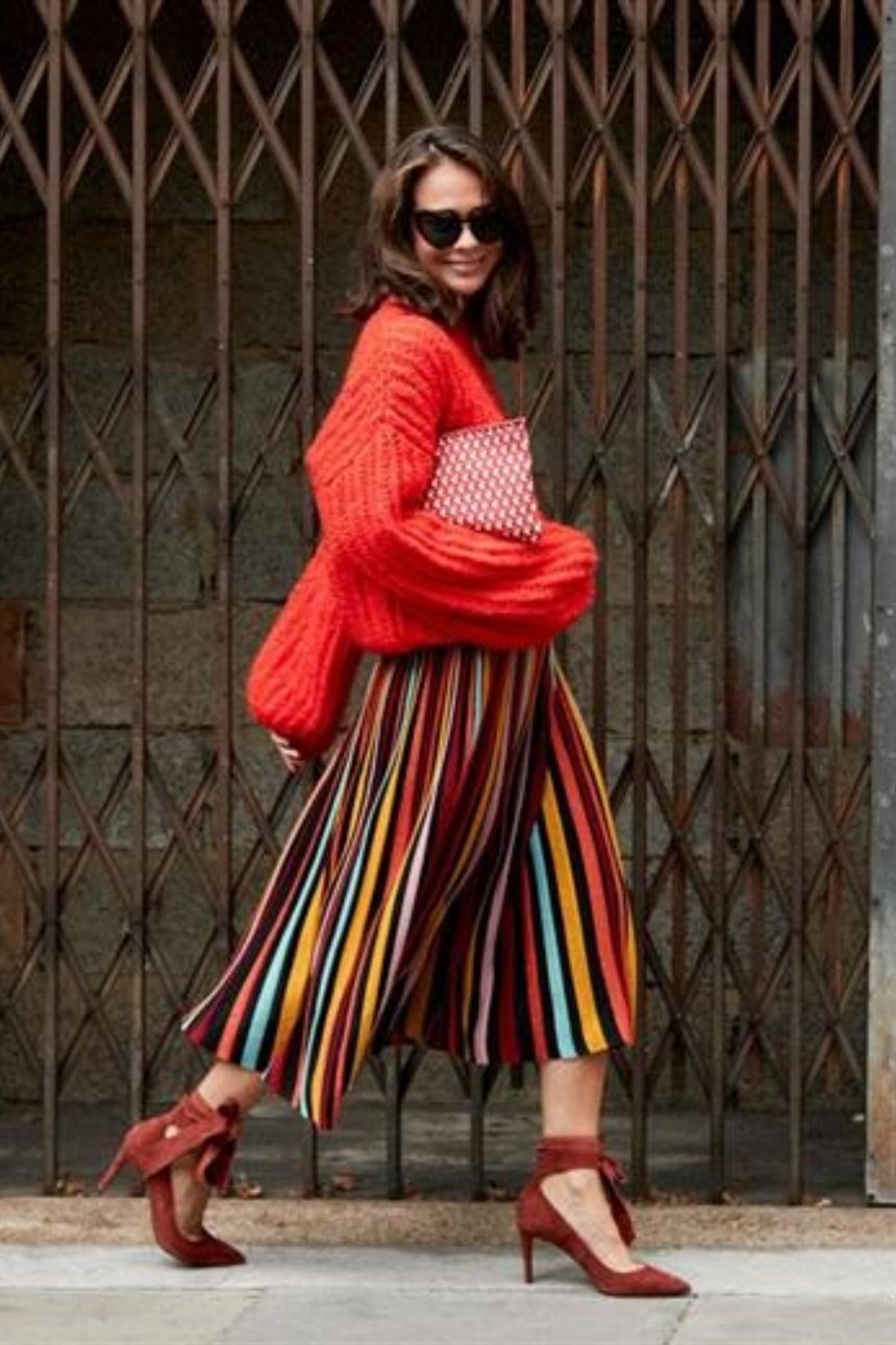 Обратите внимание на этот образ, ведь он уже завоевывает страницы Инстаграма. Комбинация юбки миди и яркого свитера XL смотрится очень стильно, оригинально. Конечно, такой образ будет выгодно смотреться с туфлями на каблуке. Выбирайте юбку с цветными вертикальными линиями, чтобы визуально удлинить силуэт.