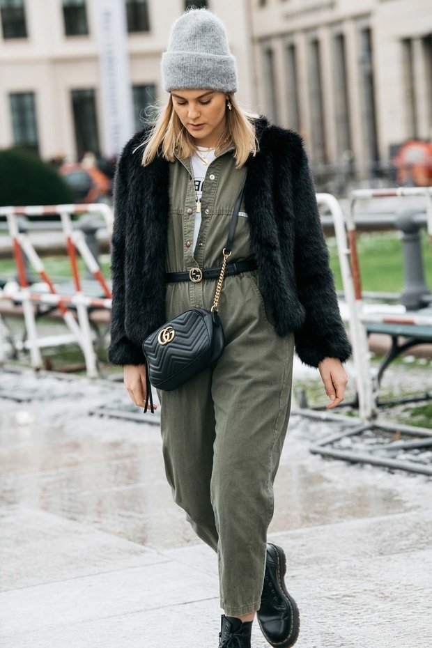 Нужно принять, что, если плащ всегда является одним из главных трендов, то комбинезон занимает достойную, но не главенствующую позицию: у него были победные сезоны и провальные. Правда в том, что комбинезоны никогда не перестанут носить. Они функциональные и, так же как и платья, могут создать целостный образ за несколько минут. Осенью и зимой можно надевать под комбинезон теплый свитер или рубашку, но самая главная вещь такого образа – меховая шуба. Благодаря этому шапка и ботинки смотрятся очень естественно и немного небрежно.