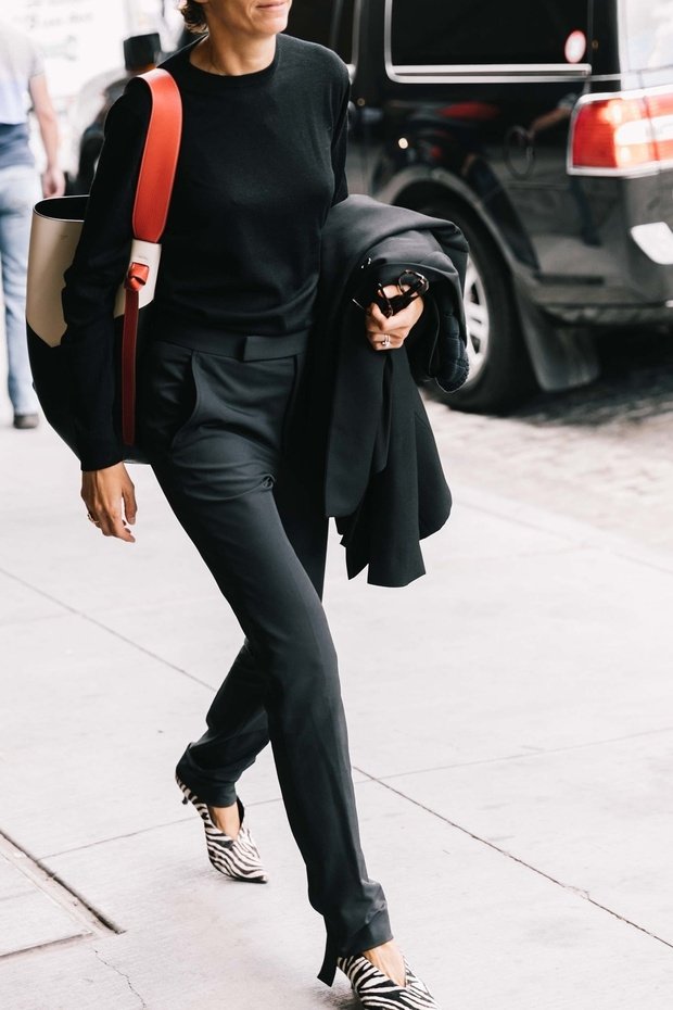Черный цвет всегда в моде. Он спасет любой образ: как праздничный, так и официальный. Такой образ очень магнетичен в любое время дня, удобен, элегантен и позволяет пофантазировать над украшениями. Хотя, они тоже должны быть в тон всему образу. Два незыблемых правила: выбирайте сумку с яркой деталью (например, с ручкой оранжевого цвета, как на фото) и туфли с животным принтом. Чем оригинальнее туфли, тем лучше.