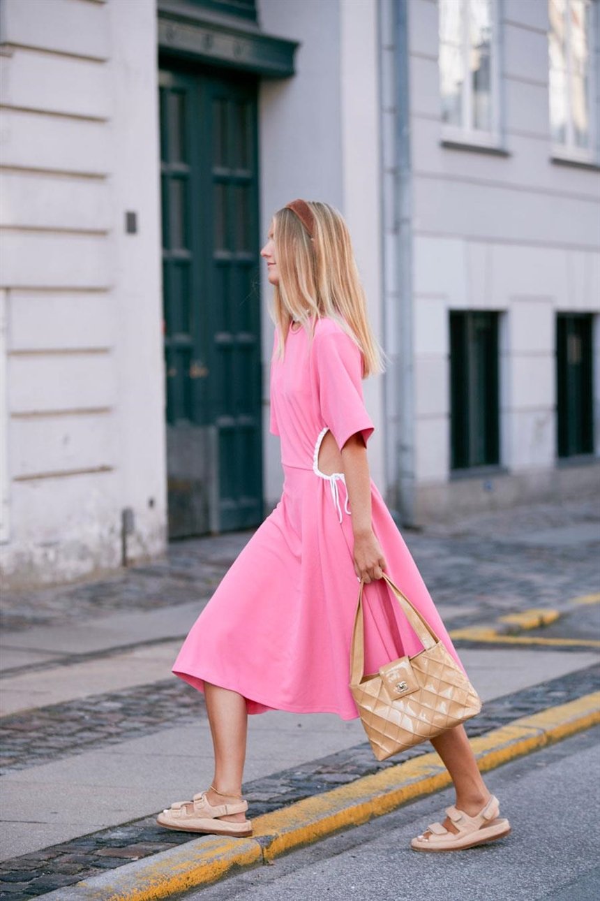 Решитесь на эксперимент с цветами! Вдохновитесь образом, что на фото, и купите, наконец, однотонное платье розового цвета. Кроме того, монохромность сейчас в моде. Вы гарантированно будете в центре внимания. Преимущественно рекомендуется тем девушкам, которые любят женственные, нежные наряды.