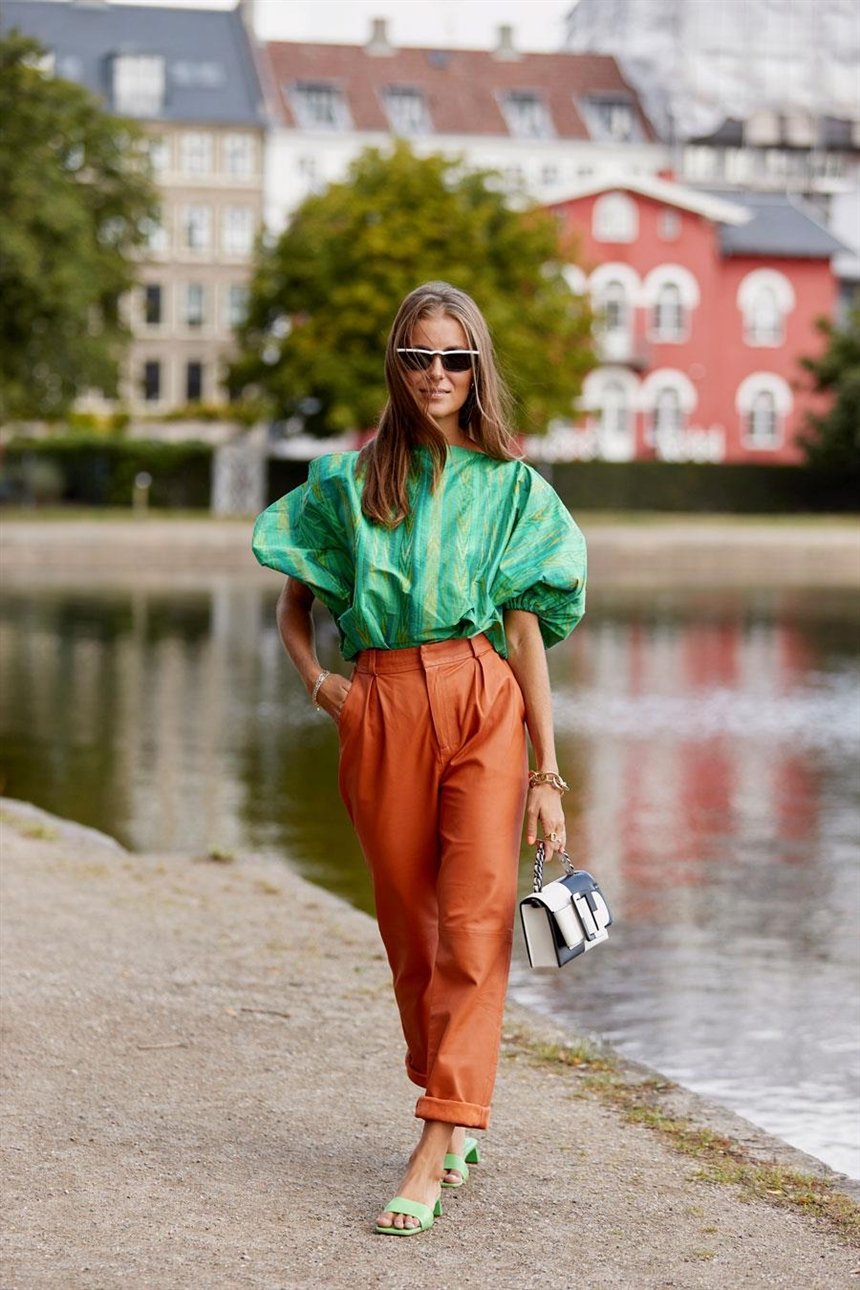 Вам точно понадобится стильная блузка зеленого цвета. Выбирайте оригинальные фасоны с объемными рукавами, модели оверсайз или более классические (сочетать с молодежными аксессуарами). Хорошей компанией этой вещице станут яркие штаны на высокой талии.