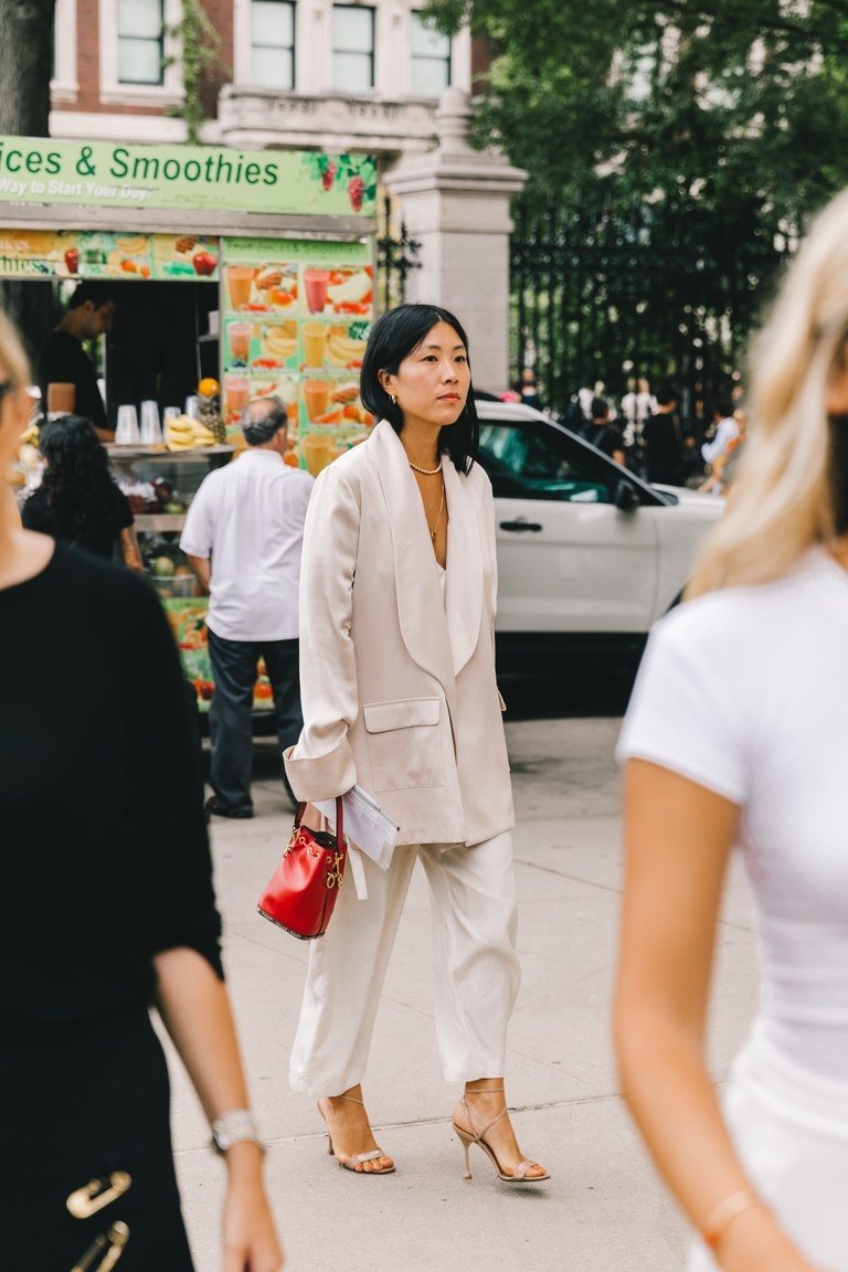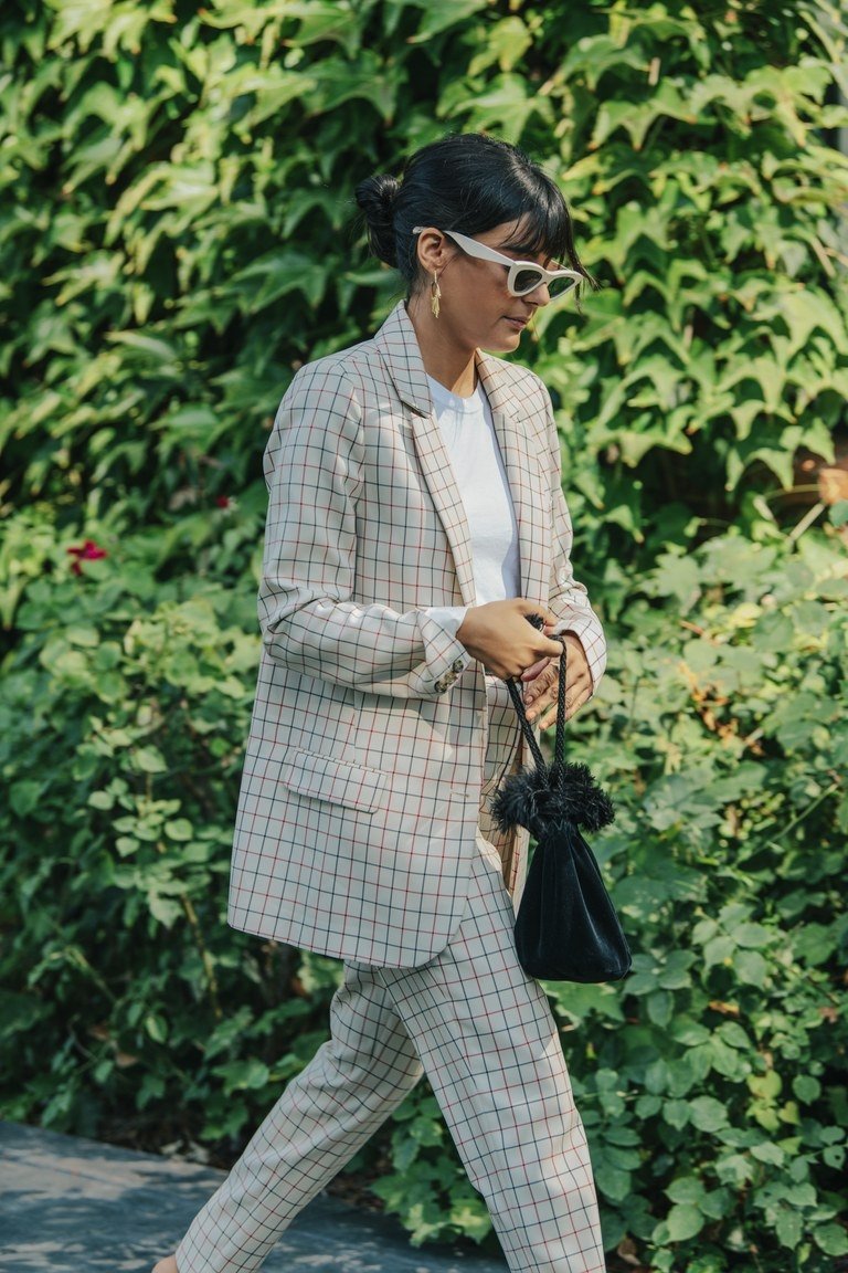 Еще одна вещь, которая никогда не выходит из моды – костюм. Такое сочетание двух стильных вещей требует базовых дополнений: белая футболка и туфли на каблуке. Как видите, тут не обойтись без оригинальной сумки, как на фото. Ну а принт делает костюм стильным и современным, а не скучным офисным нарядом. Узнайте про 13 трендовых принтов сезона весна-лето 2020, идите в ногу с новыми трендами!