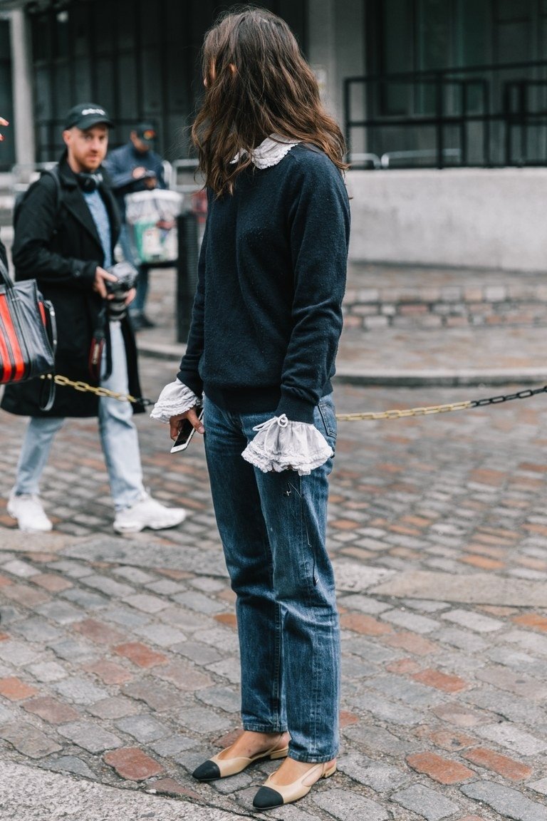 Перед вами одно из самых знаменитых, популярных сочетаний стритстайла: романтическая блузка с рюшами на манжетах и закругленный воротник и простой свитер с круглым вырезом. Сюда подойдут прямые джинсы синего цвета и балетки на плоском ходу. Удобная и стильная комбинация.