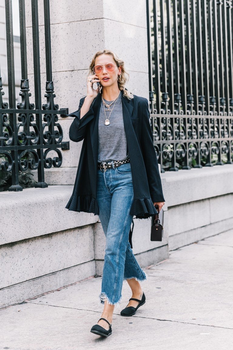 В конце прошлого лета в моду вошли балетки с ремешком. Эта милая бархатная обувь невольно переносит нас в детство, не так ли? Сейчас, несмотря на ваш возраст, они очень актуальны. Идеальный вариант, чтобы отдохнуть от каблуков, и создать очень стильное и практичное сочетание с асимметричными джинсами. Длинный пиджак, простая футболка и маленькая стильная сумочка – лучшее дополнение к этому образу.