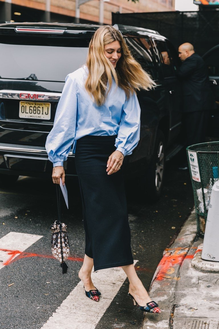 Этот вариант подойдет любительницам классических образов. Такие сочетания всегда в тренде, поэтому несложно найти соответствующий образ. Юбка-карандаш на высокой талии, длиной до щиколотки, блуза с пышными рукавами голубого цвета и туфли без задника на тонком каблуке. Чтобы придать образу оригинальности, возьмите сумку в форме мешочка.