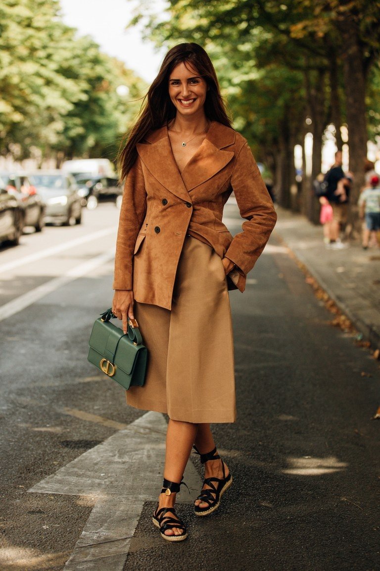 Удобный и утонченный. Так можно описать наш следующий образ. Штаны-кюлоты и замшевый пиджак оверсайз идеально гармонируют с элегантной зеленой сумкой. И не важно, что пиджак и штаны пошиты в двух разных оттенках коричневого цвета. Хотя в этом образе гармонично смотрятся босоножки с длинными ремешками, осенью вы можете заменить их на туфли на низком ходу или балетки.