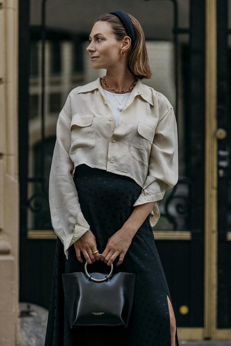 Бархатные обручи стали одним из главных аксессуаров лета и плавно переходят в новый сезон. Дом моды Prada вывел своих моделей на подиум в таких обручах на показе коллекции сезона весна-лето 2019. Именно этот показ сделал бархатные обручи топовым аксессуаром. Любимая деталь образа Блэр Уолдорф стала теперь вещью, которую можно носить ежедневно с любой одеждой. Чем не идеальный вариант для офисного образа? Сочетайте такой обруч с короткой рубашкой песочного цвета и зеленой юбкой миди с разрезом сбоку.