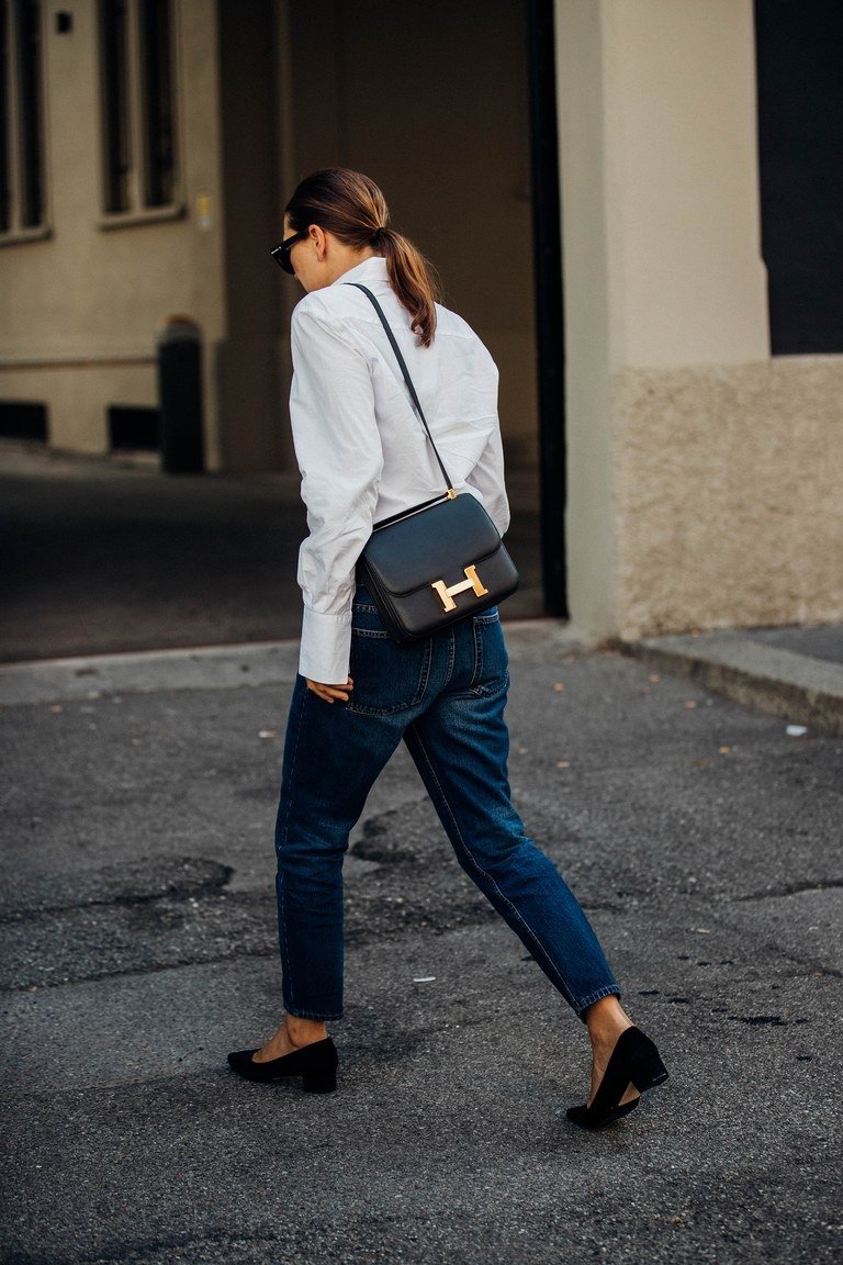 Есть один образ, который никогда не выйдет из моды. Он состоит из базовых вещей гардероба, которые точно есть у каждой девушки. Мы говорим о традиционном сочетании прямых джинсов и белой рубашки в мужском стиле. Чтобы довершить образ, нужно добавить туфли на небольшом каблуке квадратной формы и черную сумку.