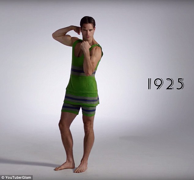 Этот взгляд назад через столетнюю историю купальников весьма информативный и увлекательный. Слегка пикантное видео от вебсайта Mode Glam начитается с 1915 года, когда человек впервые надел купальный наряд (если верить создателям ролика), состоящий из трех элементов одежды. До этого времени мужской купальник лишь немного эволюционировал от обычного нижнего белья и значительно улучшился лишь тогда, когда плавательные костюмы одолжили фасон и силуэт у борцовского синглета.