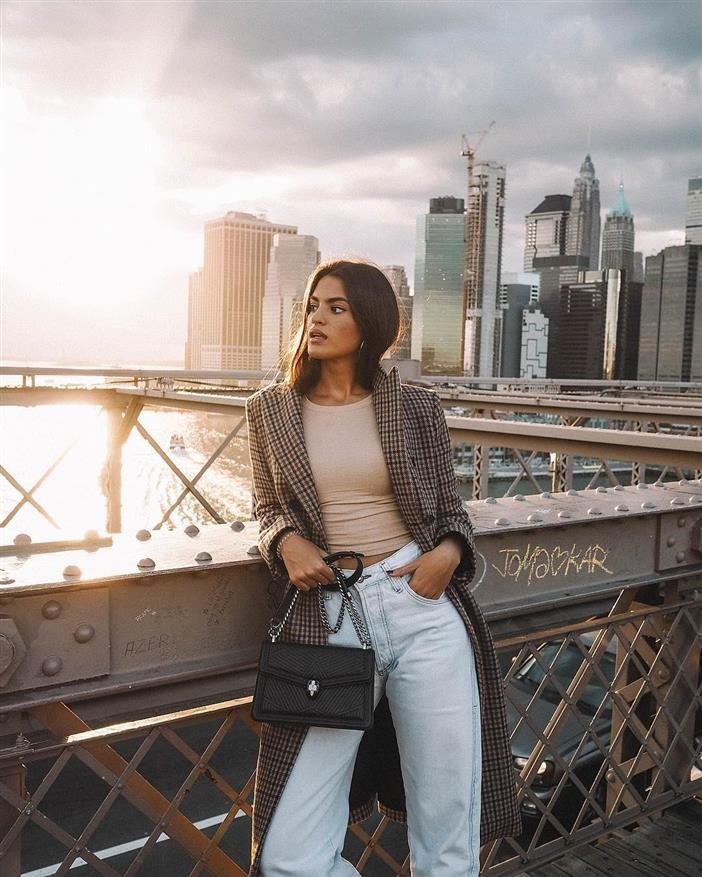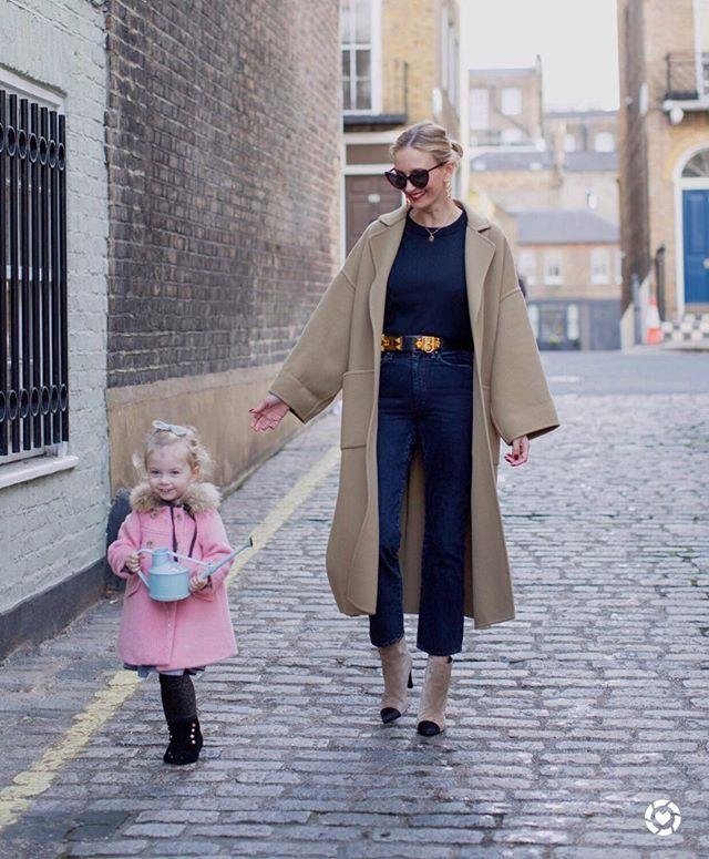 Этот образ не перестает быть популярным из-за своей элегантности и стиля. Он никогда не выходит из моды. Идеальная комбинация: темные джинсы с высокой талией, свитер того же тона и ботинки в двух цветах, чтобы немного разбить однотонность образа. Конечно, не забудьте о стильном бежевом пальто!