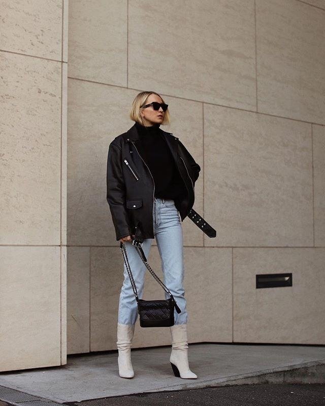 Самое прекрасное в базовых вещах – это то, что их можно комбинировать как угодно, и всегда оставаться стильной. Кожаная куртка прекрасно дополнила образ с джинсами и черным свитером с горлом. Белые ботинки придают классическую нотку уличному образу.