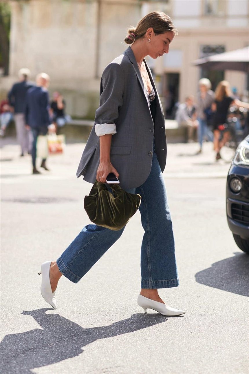Еще один вариант для тех, кто любит джинсы. Ищите простые джинсы голубого цвета с небольшим клешем снизу. Не нужно никаких ярких деталей или разрывов. Этот цвет считается одним из самых элегантных в мире джинсов, поэтому идеально подойдет для офисных образов. Чтобы джинсы действительно делали ноги стройнее, избегайте обуви на плоской подошве. Сочетайте их с пиджаком серого цвета.