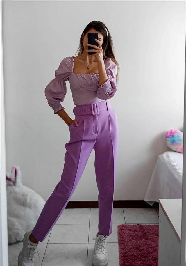 Лиловый – главный цвет 2020 года. Почему бы не отдать предпочтение стильному монохромному образу в лиловом цвете? Оригинальная блузка с объемными рукавами и вырезом, брюки на высокой талии со стрелками смотрятся стильно и оригинально в сочетании с кроссовками. Вдохновляйтесь!