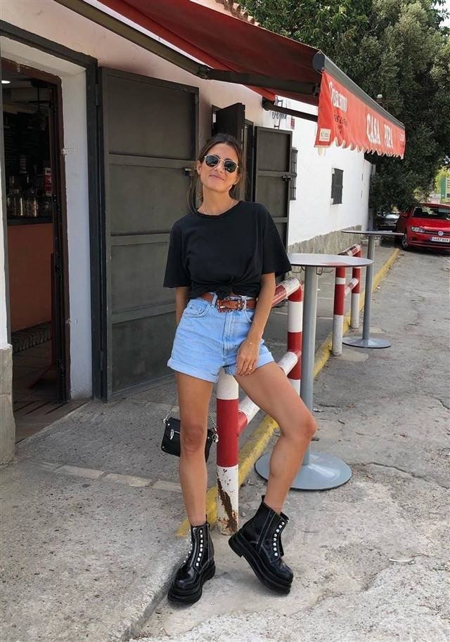 Какой красивый, простой, стильный и брутальный образ! Хороший вариант для дождливых летних дней. Вам понадобится базовая футболка, короткие джинсовые шорты и ботинки в стиле милитари. В таком наряде можно пойти на музыкальный фестиваль, вечеринку или на ужин с друзьями.