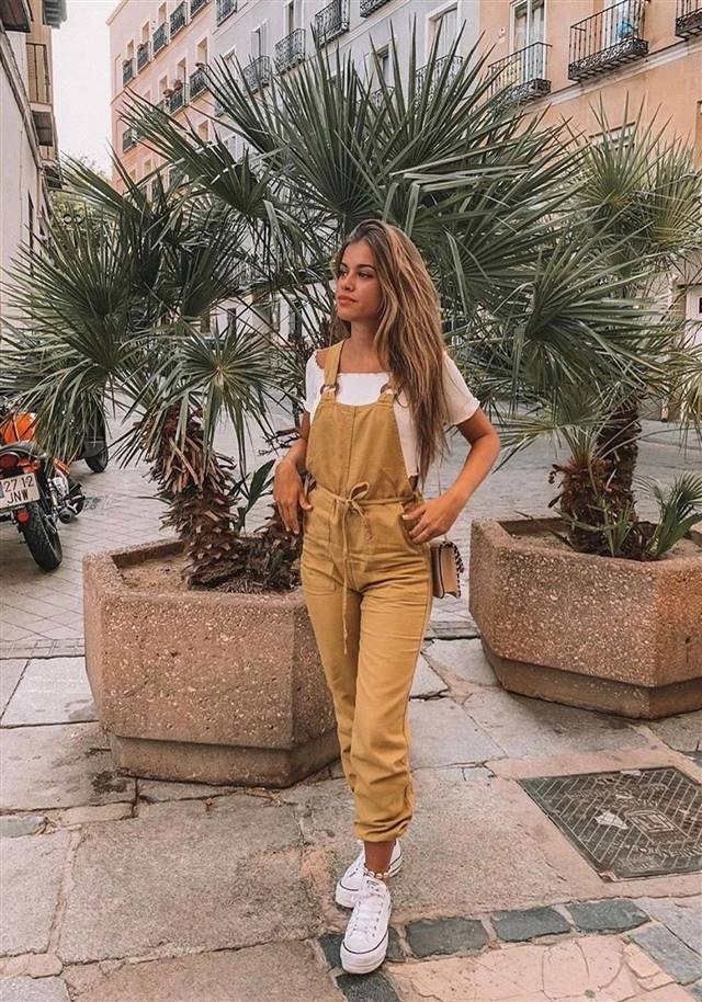 Комбинезоны в коричневых оттенках сейчас особо популярны. Ведь трендом этого сезона стал стиль сафари. Бежевый или коричневый комбинезон относится именно к этой эстетике. Кроме того, это удобная вещь, которую можно сочетать с простыми, базовыми футболками. Кроссовки или кеды – лучший вариант обуви в таком наряде.