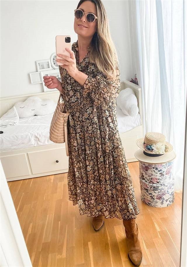 Длинное платье с цветочным принтом и замшевые ботинки – вариант на конец весны. Так что такой образ точно понадобится вам сразу после выхода из карантина. Платье должно быть объемным и летящим, из полупрозрачной ткани.