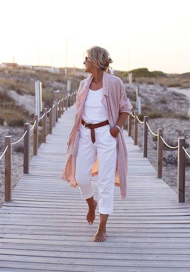 А это очень хороший пляжный вариант. Для женщин любого возраста! Белые джинсы, футболка и легкая накидка розового цвета идеально гармонируют между собой. Необходимые аксессуары – оригинальный пояс и стильные очки.