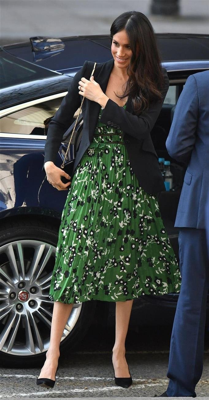 Один из главных нарядов Меган Маркл, который мы помним до сих пор. Комбинация зеленого платья марки Self-Portrait с черным пиджаком бренда Alexander McQueen остается целью главных поклонников стиля Меган Маркл.