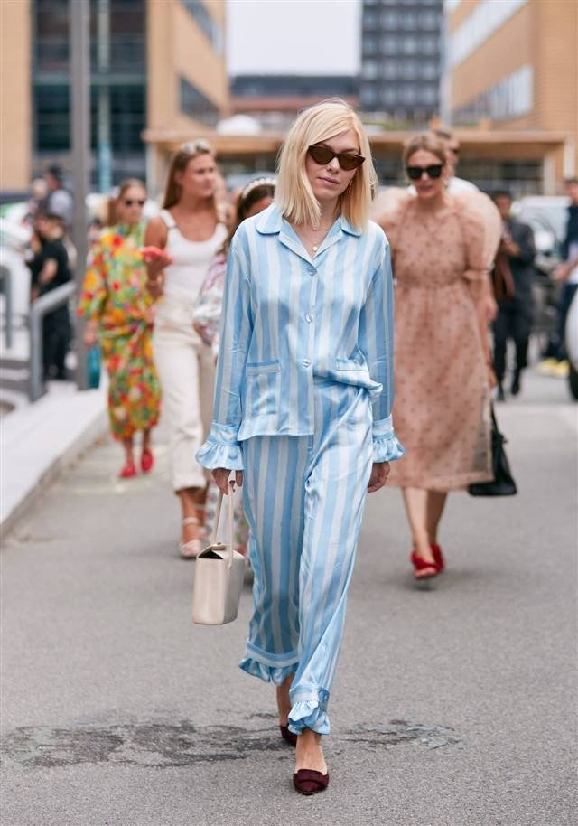 Принт с вертикальными линиями всегда выгодно подчеркивает фигуру, поэтому идеально подойдет для девушек с пышными формами. Кроме того, этот принт выглядит особенно стильно в трендовых, нежных оттенках. Как вам образ, что на фото? Уличные пижамы тоже будут в тренде этой весной, не упустите возможность прикупить себе такую вещь.