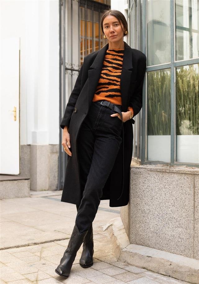 Да, есть и такие оригинальные вещи, как свитер с животным принтом. Истинные модницы уже давно прикупили себе несколько таких! В этом случае старайтесь подобрать все остальные вещи в одном тоне. Лучший вариант – черный, как на фото. Ну и не забывайте о трендовых аксессуарах, ведь их всегда не хватает в любом образе.