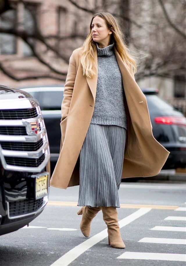 Сочетание таких цветов выглядит очень стильно! Такой наряд идеально подойдет для выхода на работу. Серая юбка миди, свитер оверсайз и классическое бежевое пальто и замшевые сапоги бежевого цвета… Что еще нужно для стильного осеннего образа? Этот наряд доказывает, что серые свитера всегда выглядят очень элегантно.