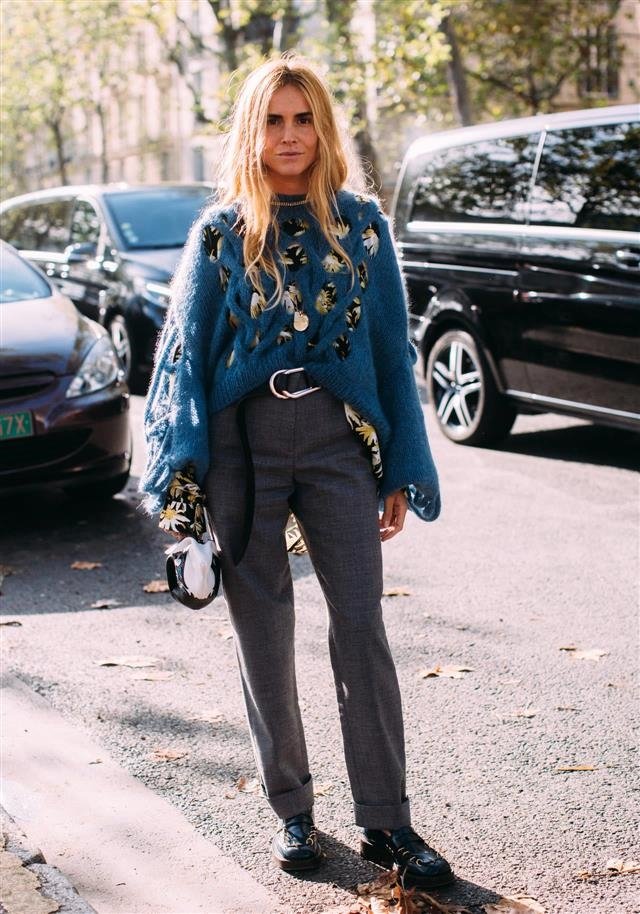 Свитера с вышивкой всегда смотрятся оригинально. Носите их с простыми вещами, чтобы не сместить акцент и не перенасытить образ яркими вещами. Вдохновитесь образом на фото: благодаря серым брюкам создается контраст между верхом в стиле бохо и формальным низом.