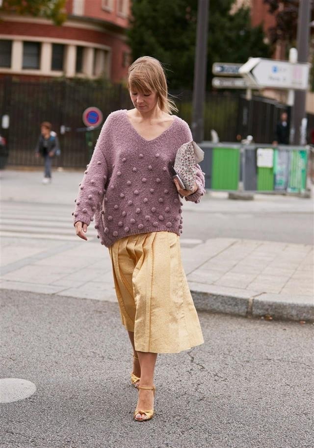 Вы просто обожаете свой свитер оверсайз лавандового цвета? Тогда не стесняйтесь его носить, ведь этот цвет стал трендом сезона осень-зима 2019/2020. Такой свитер идеально смотрится с юбкой миди золотистого цвета. Перед вами романтический и очень женственный осенний образ.