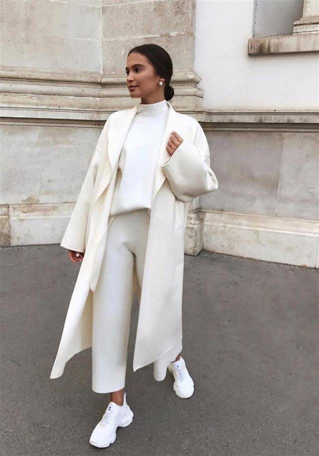 Белый цвет – это не табу для зимы! Сочетайте свой белый свитер со штанами, пальто и обувью того же цвета. Это идеальный зимний наряд в минималистичном стиле от настоящих модниц и звезд Инстаграма.