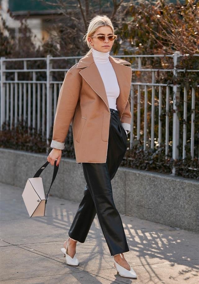 Этот наряд еще раз доказывает, что базовые вещи способны создать очень элегантные, трендовые образы. Белый свитер, классическое бежевое пальто и черные кожаные штаны простого кроя – это все, что вам нужно для одного из самых стильных нарядов осени.