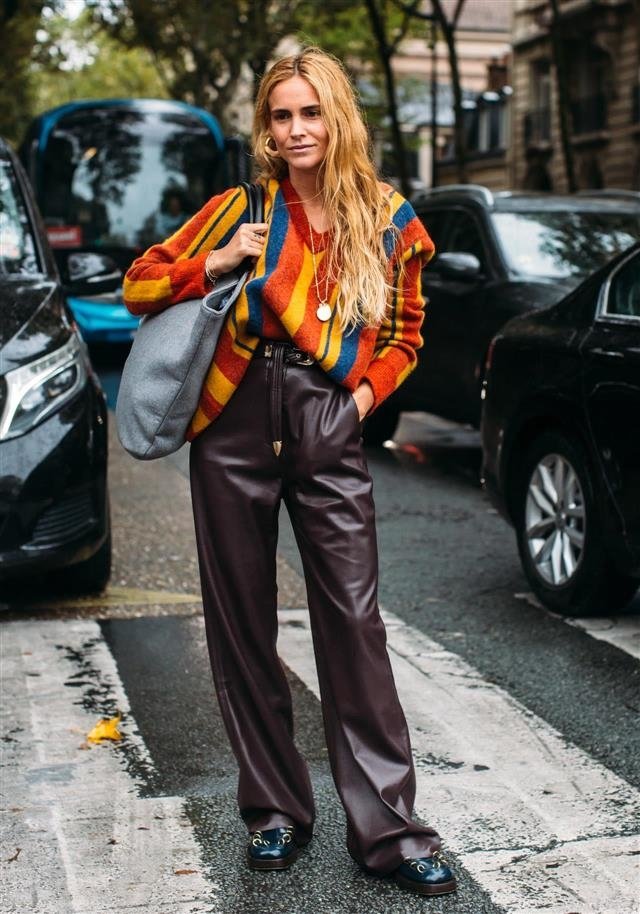 Если у вас в шкафу давно лежит разноцветный свитер и вы не знаете, как и с чем его сочетать, то этот вариант точно для вас. Да, помимо джинсов существует множество вариантов сочетания… Например, обратите внимание на кожаные штаны клеш баклажанового цвета. Чтобы образ с ярким свитером был сбалансированным, нужно искать темный низ.