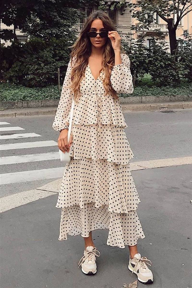 Объем все еще в моде. И даже такое нежное, воздушное платье можно носить с кроссовками! Выглядит это очень стильно и гармонично. Смело повторяйте образ, что на фото.