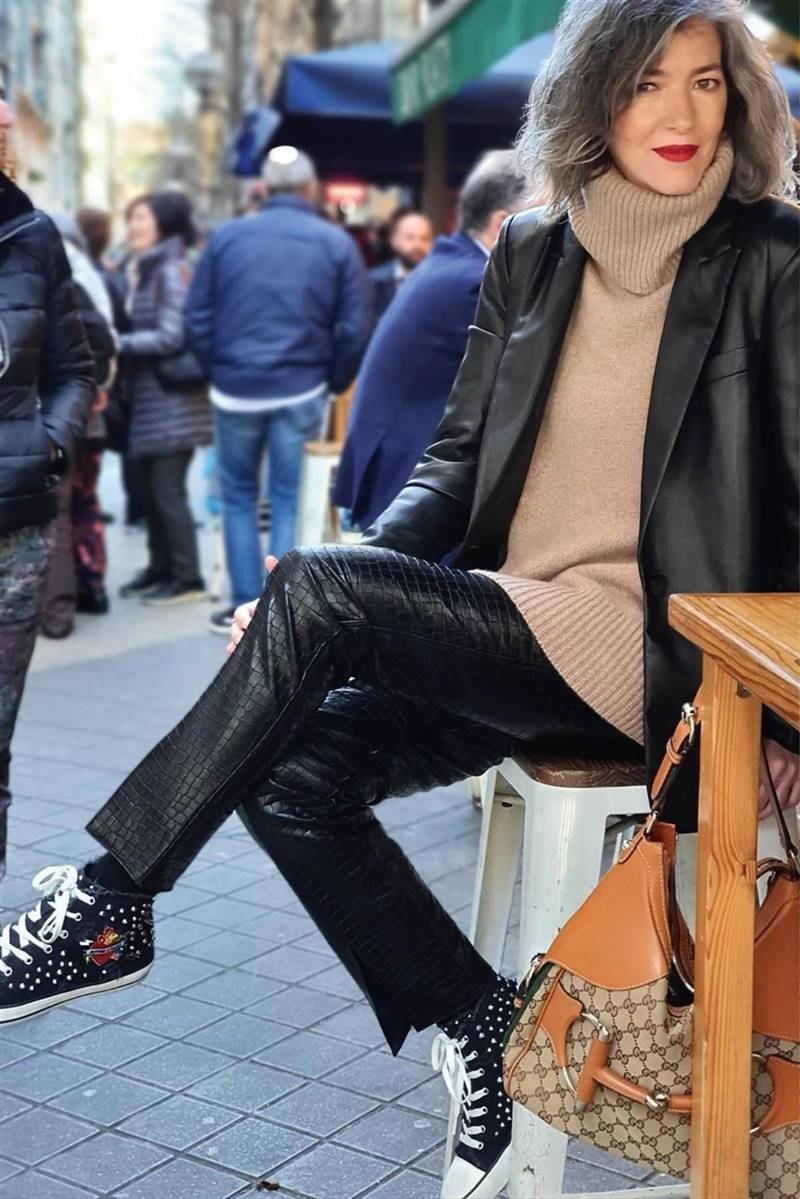 Этот наряд просто идеальный для прохладных дней. Кожаные штаны и пиджак, базовый свитер и смелые кеды с заклепками – хорошее сочетание даже для женщин 50+.