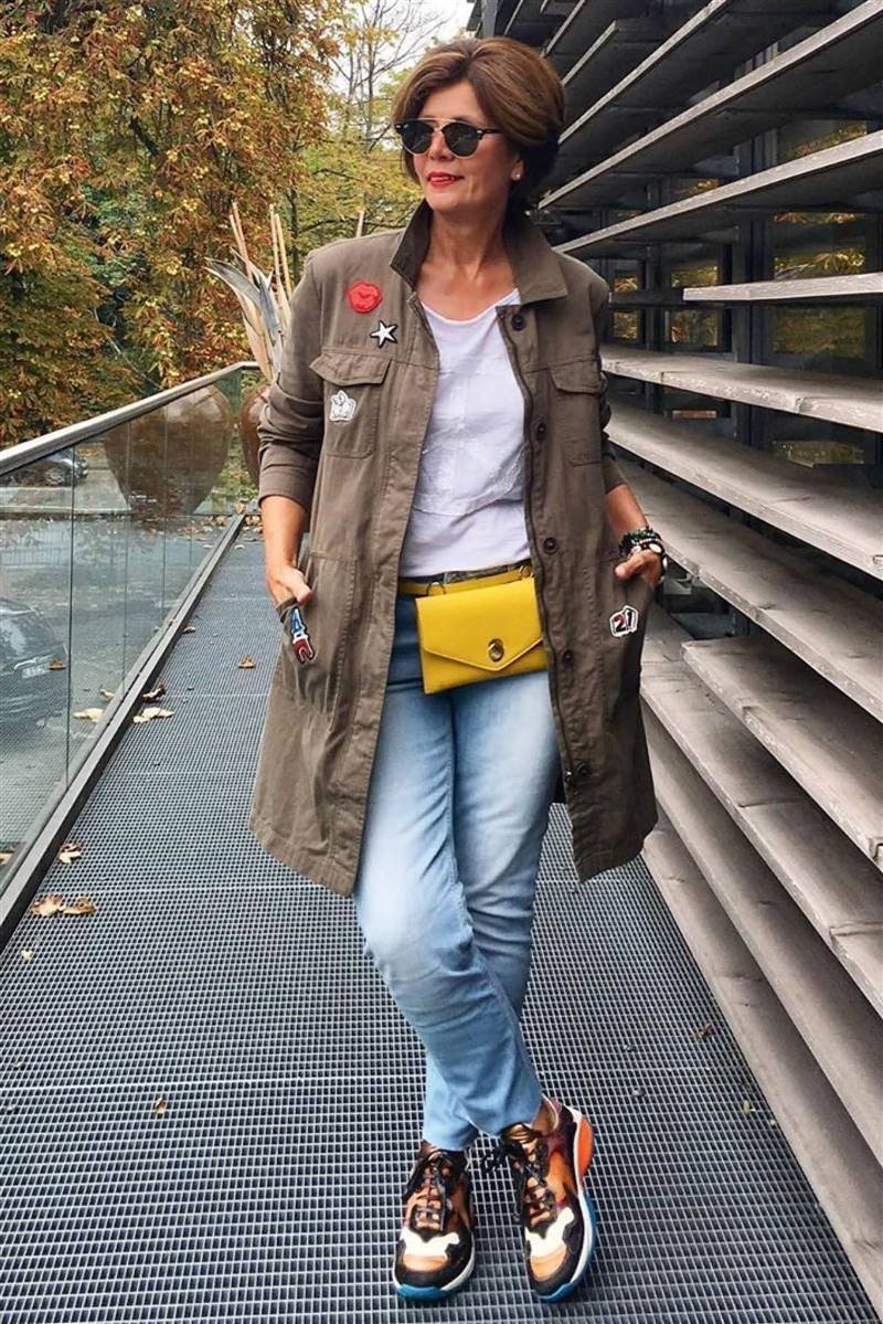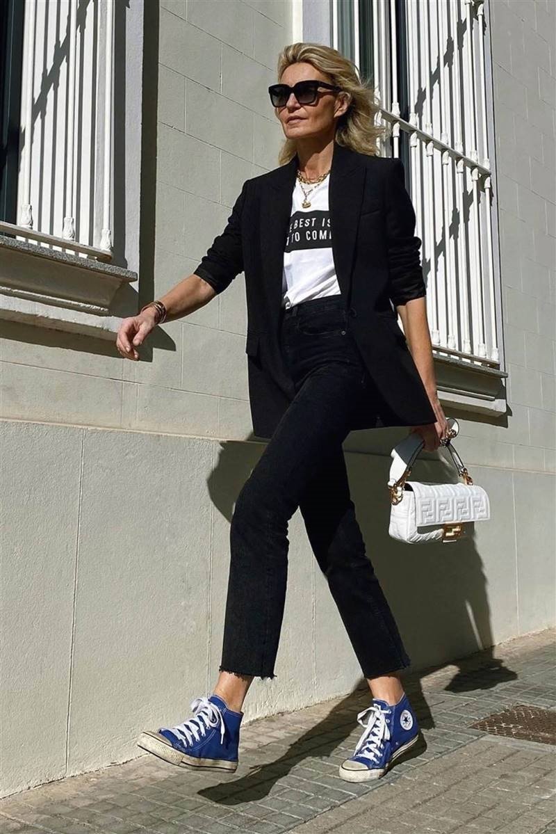 Монохромный образ в черном цвете – это не новинка, но только посмотрите, как хорошо он смотрится с белой футболкой и синими кедами. Это один из самых любимых нарядов фешн-блогеров 50+.
