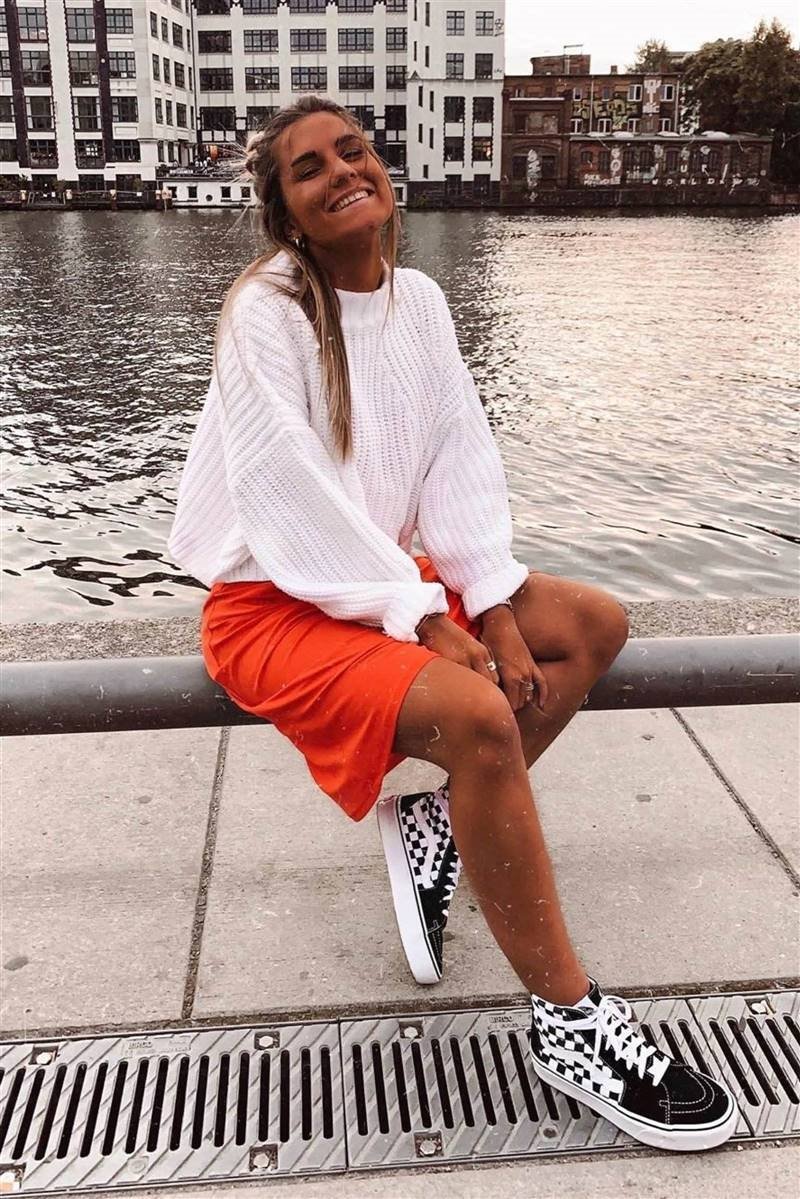 Сочетайте свою классическую юбку с базовым свитером оверсайз и высоким кедами. Образ выглядит женственно и даже романтично.