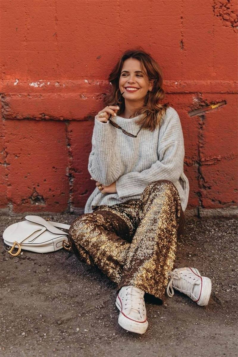 Даже вот такие яркие, блестящие штаны отлично смотрятся с кедами. Почему не отправиться на свадьбу в таком наряде? Вам понадобятся штаны в золотистых пайетках, свитер оверсайз серого цвета и белые кеды. Золотистые аксессуары дополнят праздничный наряд.
