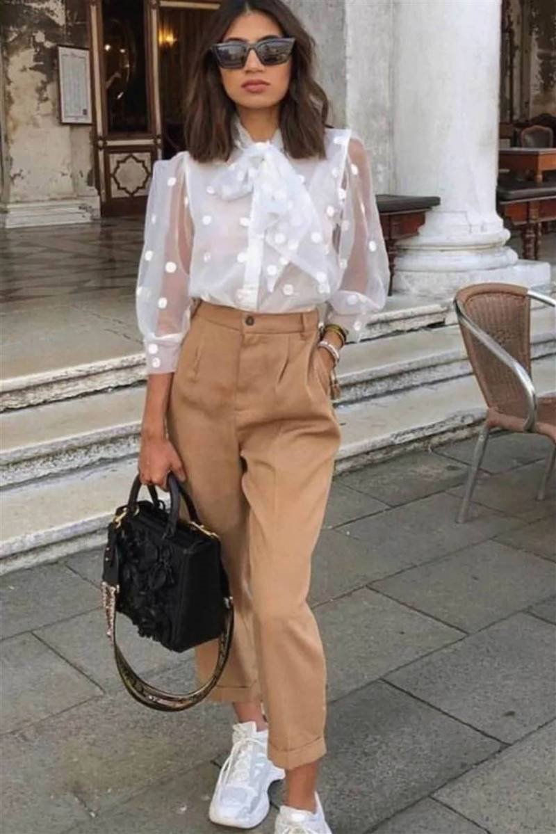 Наверняка у вас в гардеробе уже есть подобная блузка (ведь этот фасон уже несколько сезонов остается в тренде). Такой образ очень легко повторить: сочетайте эту блузку с укороченными брюками на высокой талии.