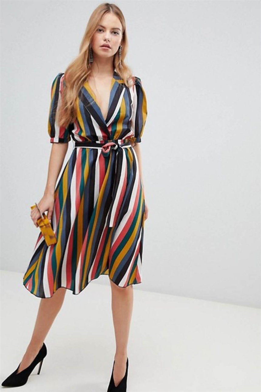 Вертикальные полосы в этом платье визуально вытягивают ваш силуэт, делают его стройнее и выше. Кроме того, эта модель с глубоким декольте выгодно подчеркнет вашу грудь.