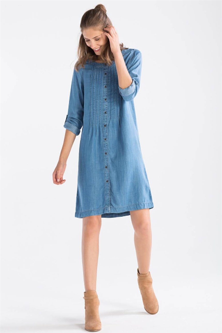 Если вы любите джинсовые платья, то это прекрасный вариант, чтобы сделать силуэт утонченным. Если у вас фигура в форме "А", то такой фасон визуально уменьшит бедра и живот.