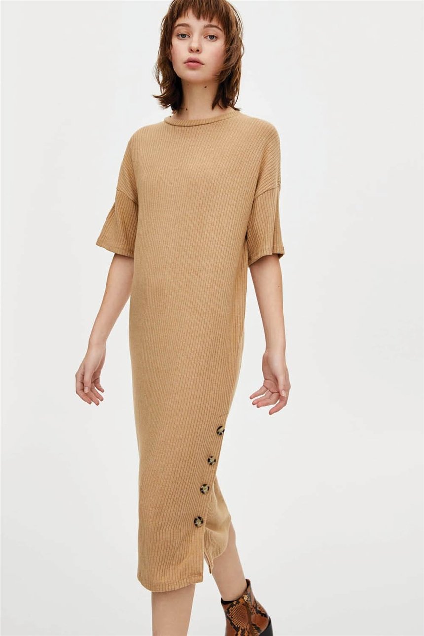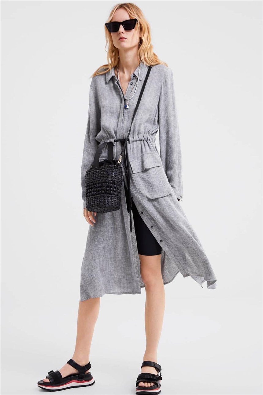 Нам очень нравится такая модель платья, ведь оно не облегает тело, обеспечивает комфорт и придаетстиля. Оно прекрасно подойдет для весеннего образа. Чтобы не было жарко, можно расстегнуть несколько пуговиц и даже продемонстрировать свои ноги. Только возьмите на заметку эти короткие черные леггинсы, которые так стильно смотрятся с серым платьем.