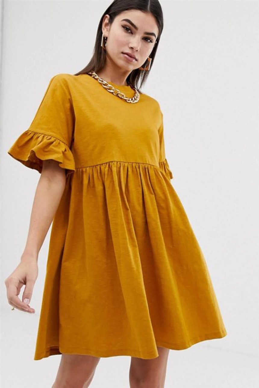 Одна из самых любимых тенденций этого сезона. Это платье не облегает, а наоборот, перемещает акцент с бедер и живота на плечи. Розовый пастельный цвет идеально подойдет для весеннего образа.